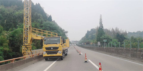 一輛橋梁檢測車在成渝高速麻柳灣大橋橋側撐起腳架,臂架經旋轉與橋側垂直,伸縮臂旋轉后,慢慢展開。橋梁工程師們戴著安全帽,身著工作服,拿著專業的檢測設備進入檢測平臺,橋梁外觀缺陷、混凝土碳化深度、混凝土強度、鋼筋保護層厚度、鋼筋銹蝕等,一項項檢測工作有序進行,2021年度首次橋梁檢測工作就此展開。