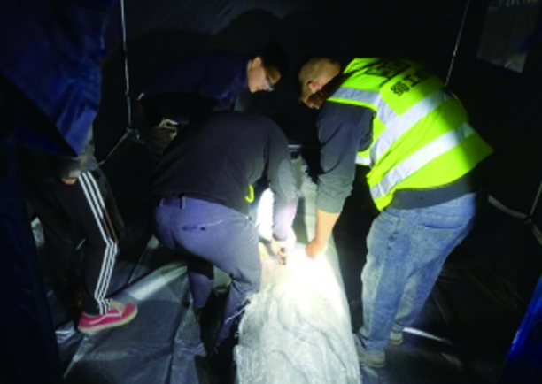 9月8日晚,災后安全排查隊在手機照明中搭建帳篷