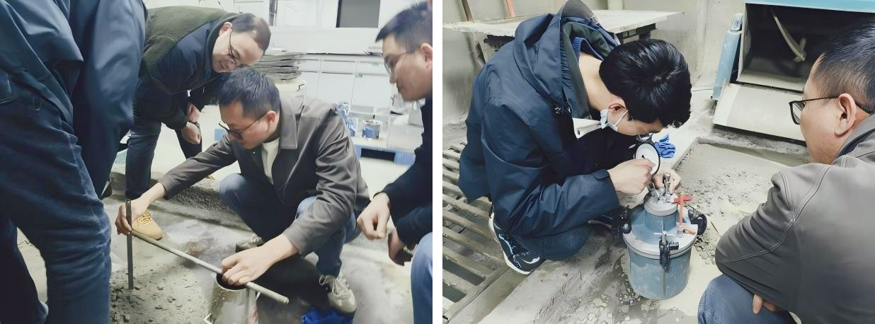 隨后,全體黨員來到水泥混凝土試驗室,支部黨員、技術骨干方肖圍繞設計方案和實操要點,進行了講解示范。參與人員分工協作,完成了稱料、拌制等操作,測量了混凝土拌合物的坍落度、擴展度以及含氣量,并針對拌合物狀態進行了現場討論。