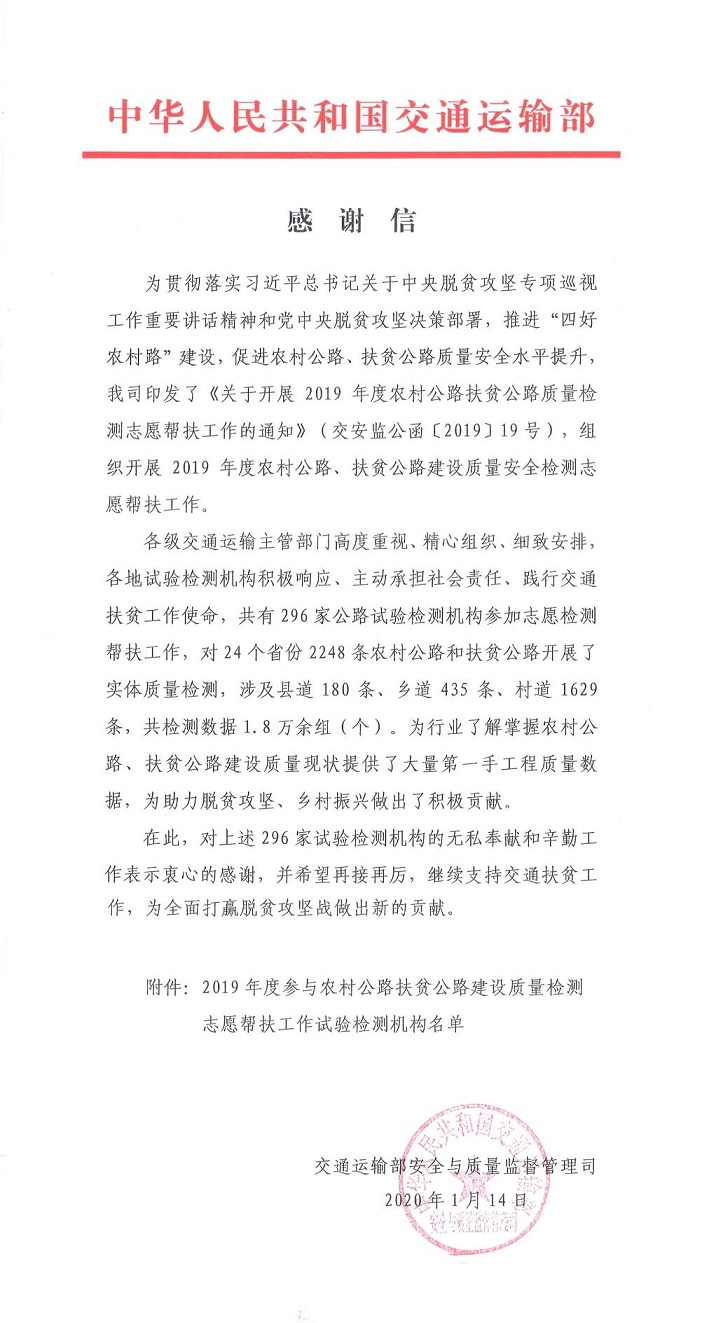 2020年1月16日,交投建設公司子公司蜀工檢測公司收到交通運輸部發來的感謝信。感謝檢測公司2019年度為志愿幫扶農村公路扶貧檢測作出的貢獻,為行業了解掌握農村公路、扶貧公路建設質量現狀提供了大量第一手工程質量數據。