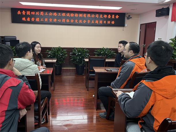 “中國夢·勞動美——奮進新時代”學習貫徹黨的二十大精神省委宣講團勞模工匠宣講分團走進蜀道集團宣講活動于11月18日上午在蜀道集團大廈隆重開講,為進一步推動團員青年健康成長,激發見賢思齊、創先爭優的干事熱情,四川交建蜀工檢測公司團支部組織機關全體團員干部、工地試驗室團員青年共38人線上觀看了宣講活動直播,認真聆聽4位勞模工匠的建功歷程。