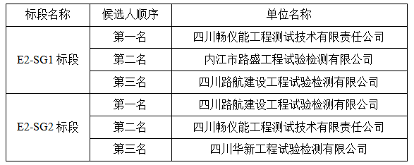 四川蜀工公路工程試驗檢測有限公司于2019年7月2日組織了成樂高速公路擴容建設(shè)項目E2-SG1、E2-SG2標段工地試驗室開標、評標工作。現(xiàn)予以公示,接受社會監(jiān)督: