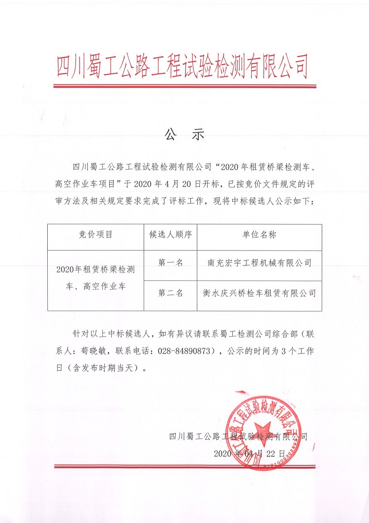 四川蜀工公路工程試驗檢測有限公司于2020年4月20日組織了2020年租賃橋梁檢測車、高空作業車項目開標、評標工作。現對評標結果予以公示,接受社會監督。