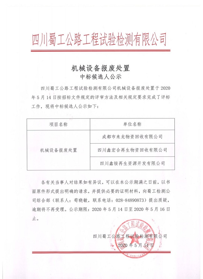 四川蜀工公路工程試驗檢測有限公司機械設備報廢處置于2020年5月14日按招標規定的評審方法及相關規定要求完成了評標工作,現將中標候選人公示如下: