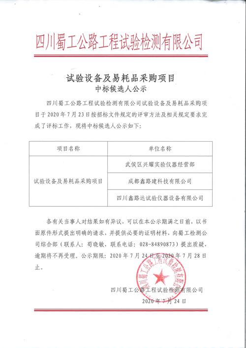 試驗設備及易耗品采購項目中標候選人公示
