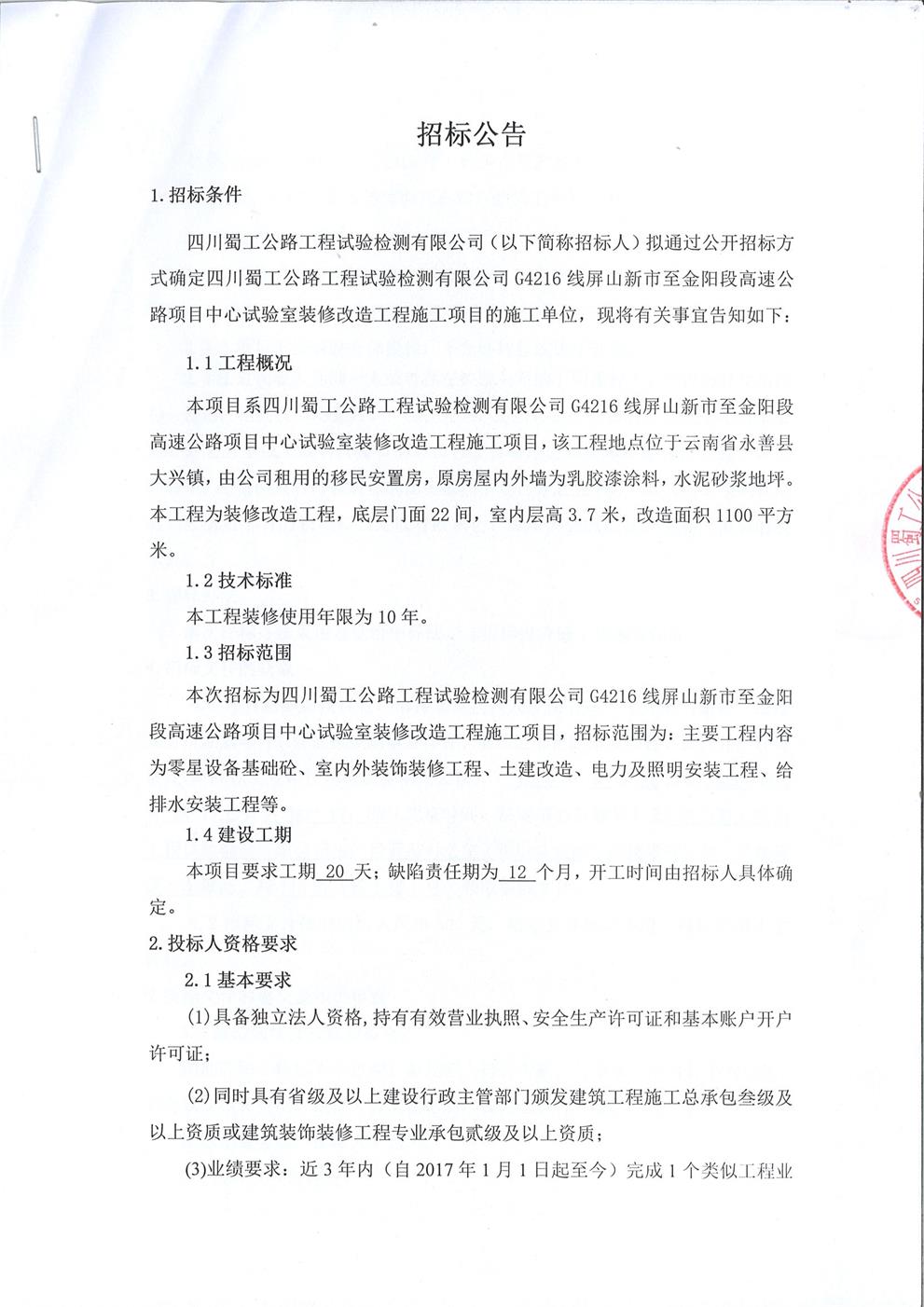 G4216線屏山新市至金陽段高速公路項目中心試驗室裝修改造工程施工項目招標公告