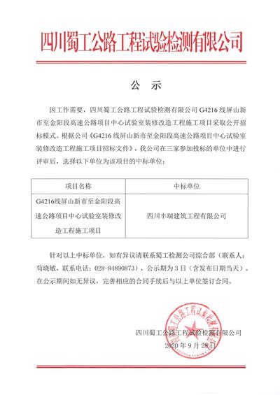 G4216線屏山新市至金陽段高速公路項目中心試驗室裝修改造工程施工項目中標公示