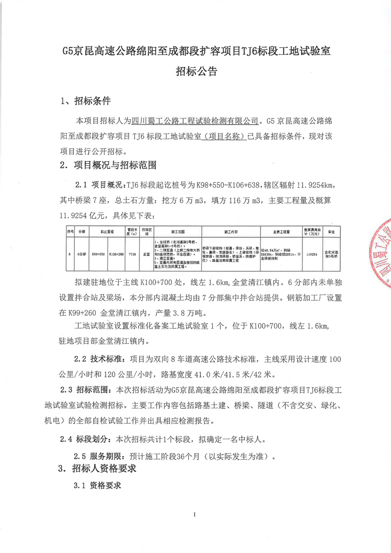 G5京昆高速公路綿陽至成都段擴容項目TJ6標段工地試驗室招標公告