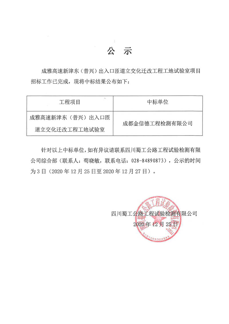 成雅高速新津東(普興)出入口匝道立交化遷改工程工地試驗室中標(biāo)公示