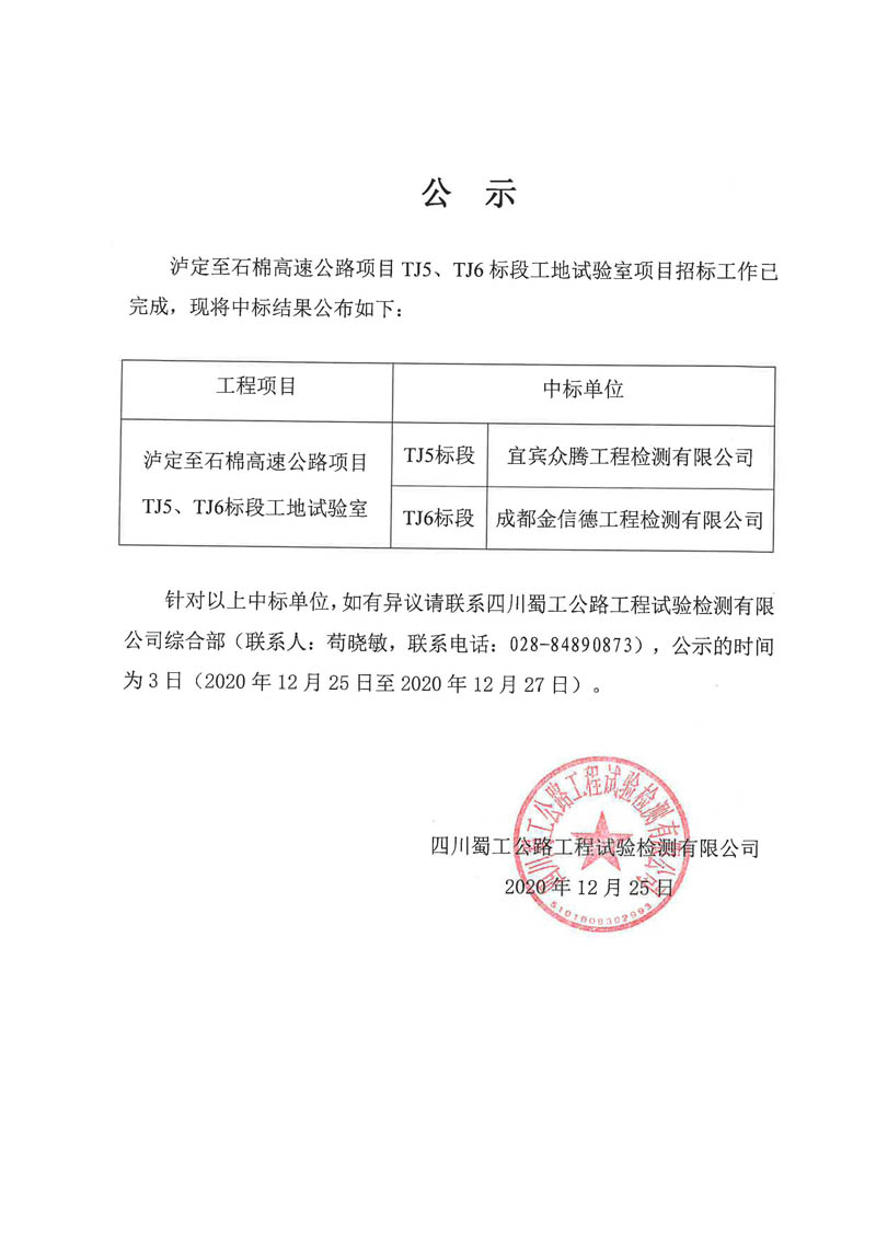 瀘定至石棉高速公路項目TJ5、TJ6標段工地試驗室中標公示