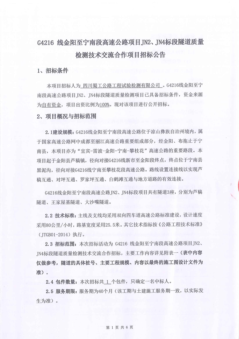 G4216 線金陽至寧南段高速公路項目JN2、JN4標段隧道質量檢測技術交流合作項目招標公告