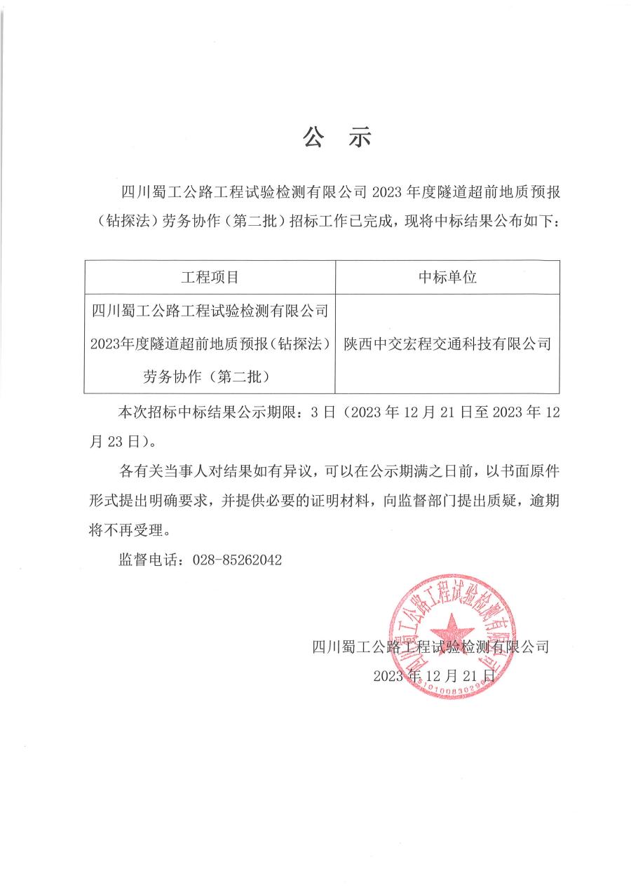四川蜀工公路工程試驗檢測有限公司2023年度隧道超前地質預報(鉆探法)勞務協作(第二批)中標公示
