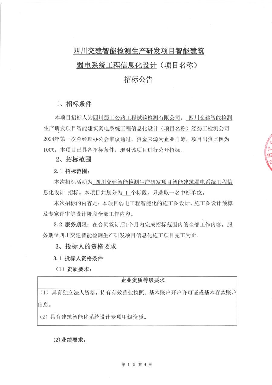 四川交建智能檢測生產研發項目智能建筑弱電系統工程信息化設計招標公告