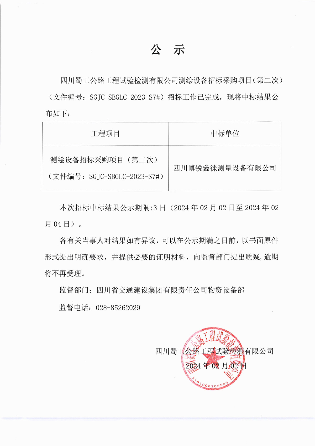 測繪設備招標采購項目(第二次)(文件編號:SGJC-SBGLC-2023-S7#)中標公示