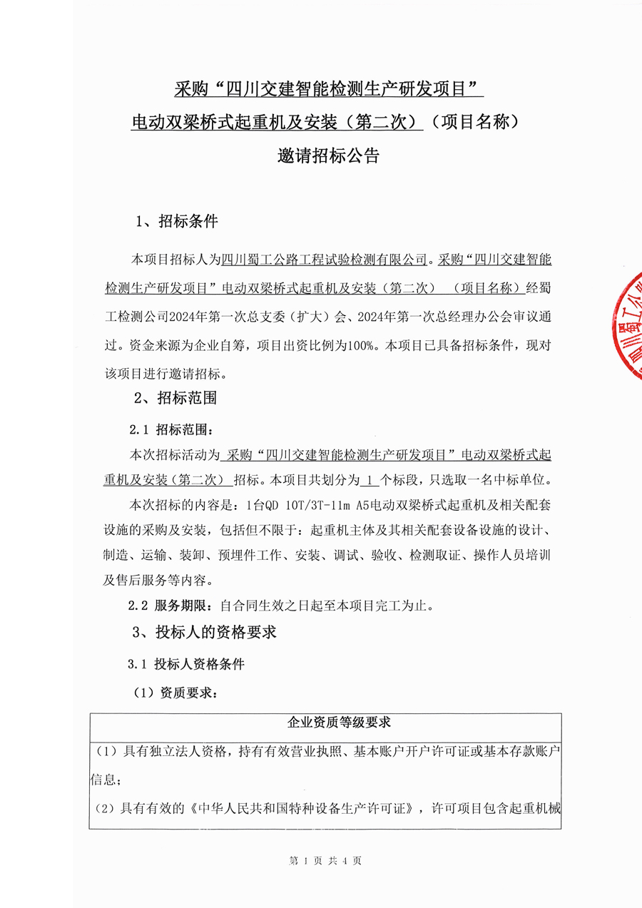 采購“四川交建智能檢測生產研發項目”電動雙梁橋式起重機及安裝(第二次)招標公告