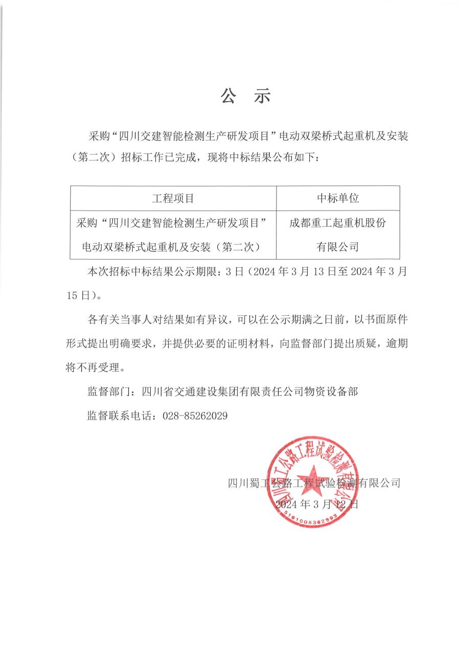 采購“四川交建智能檢測生產研發項目”電動雙梁橋式起重機及安裝(第二次)中標公示