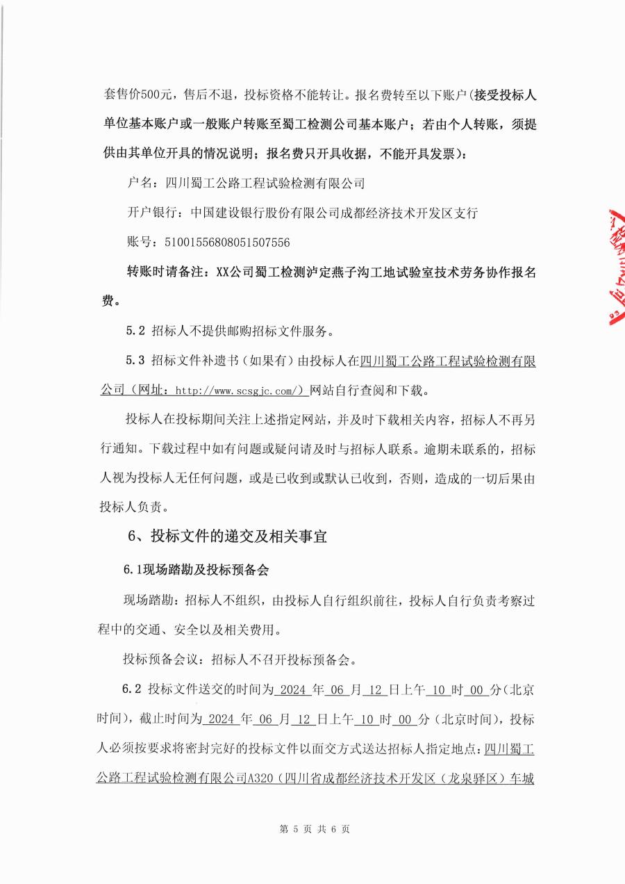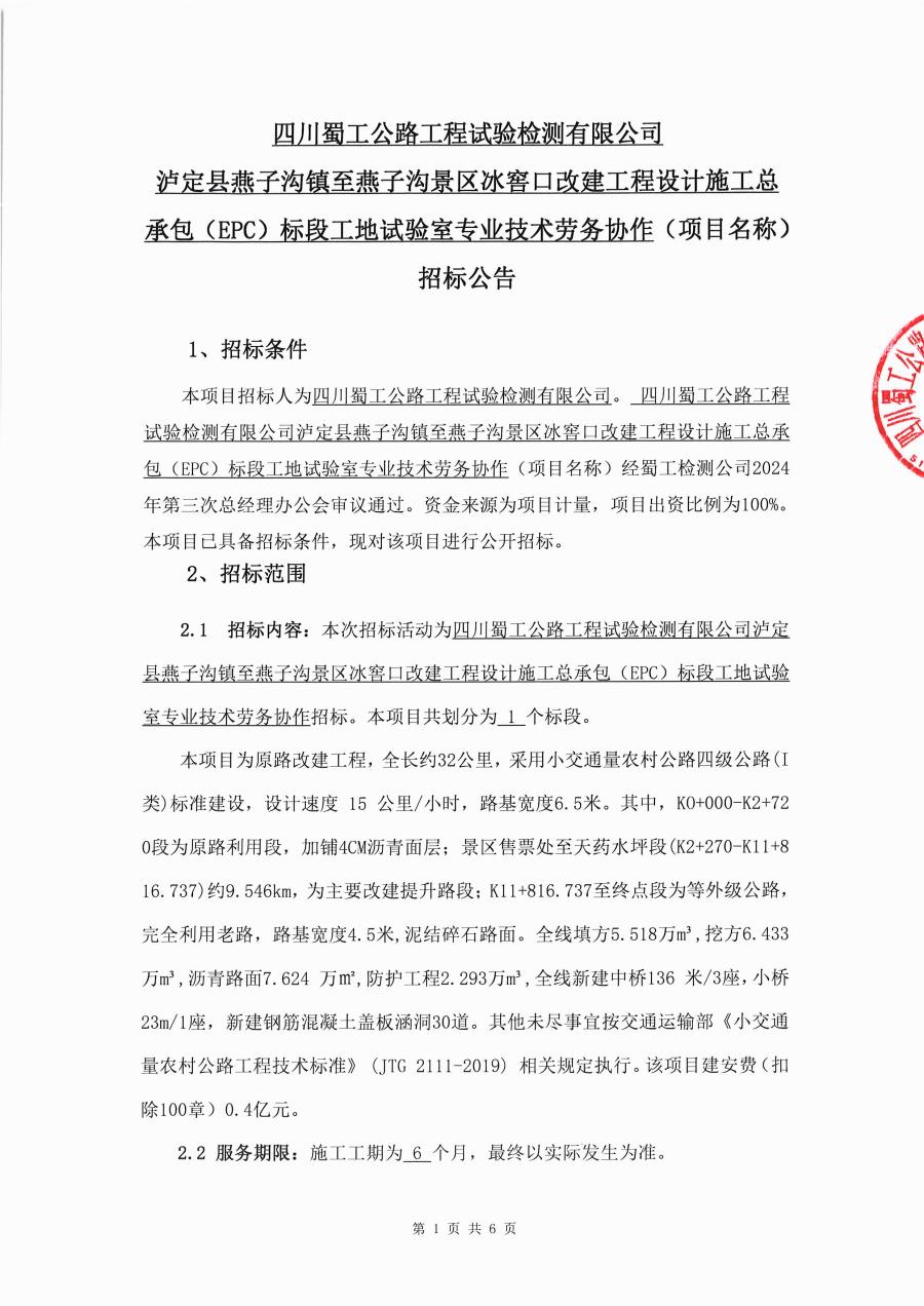 四川蜀工公路工程試驗檢測有限公司瀘定縣燕子溝鎮至燕子溝景區冰窖口改建工程設計施工總承包(EPC)標段工地試驗室專業技術勞務協作招標公告