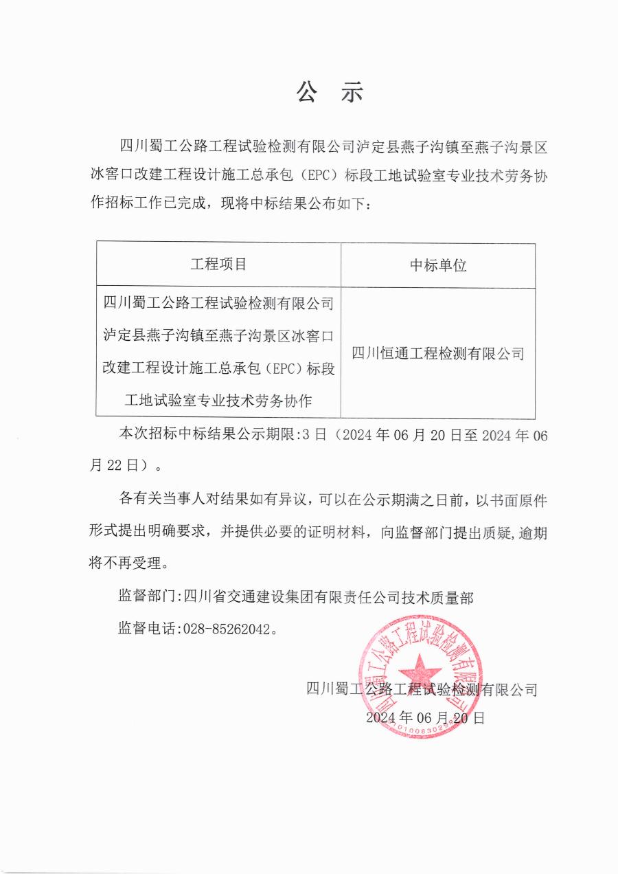 四川蜀工公路工程試驗檢測有限公司瀘定縣燕子溝鎮至燕子溝景區冰窖口改建工程設計施工總承包(EPC)標段工地試驗室專業技術勞務協作中標公示