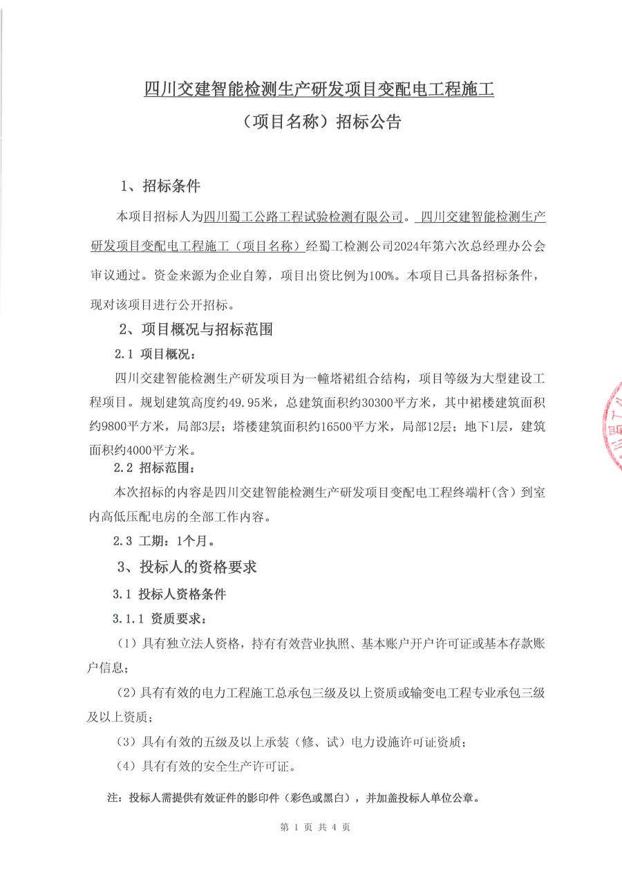 四川交建智能檢測(cè)生產(chǎn)研發(fā)項(xiàng)目變配電工程施工招標(biāo)公告