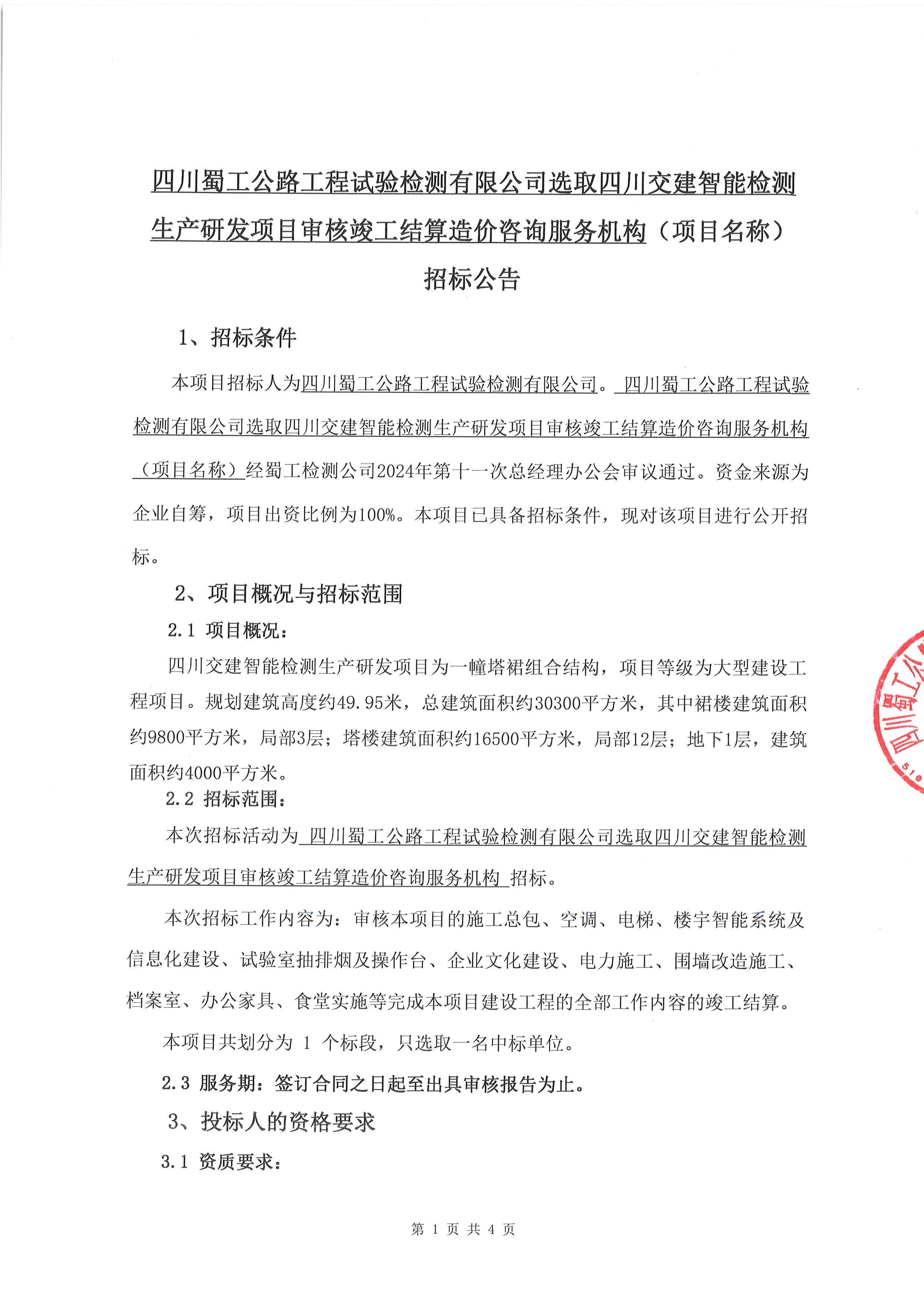 四川蜀工公路工程試驗檢測有限公司選取四川交建智能檢測生產研發項目審核竣工結算造價咨詢服務機構招標公告