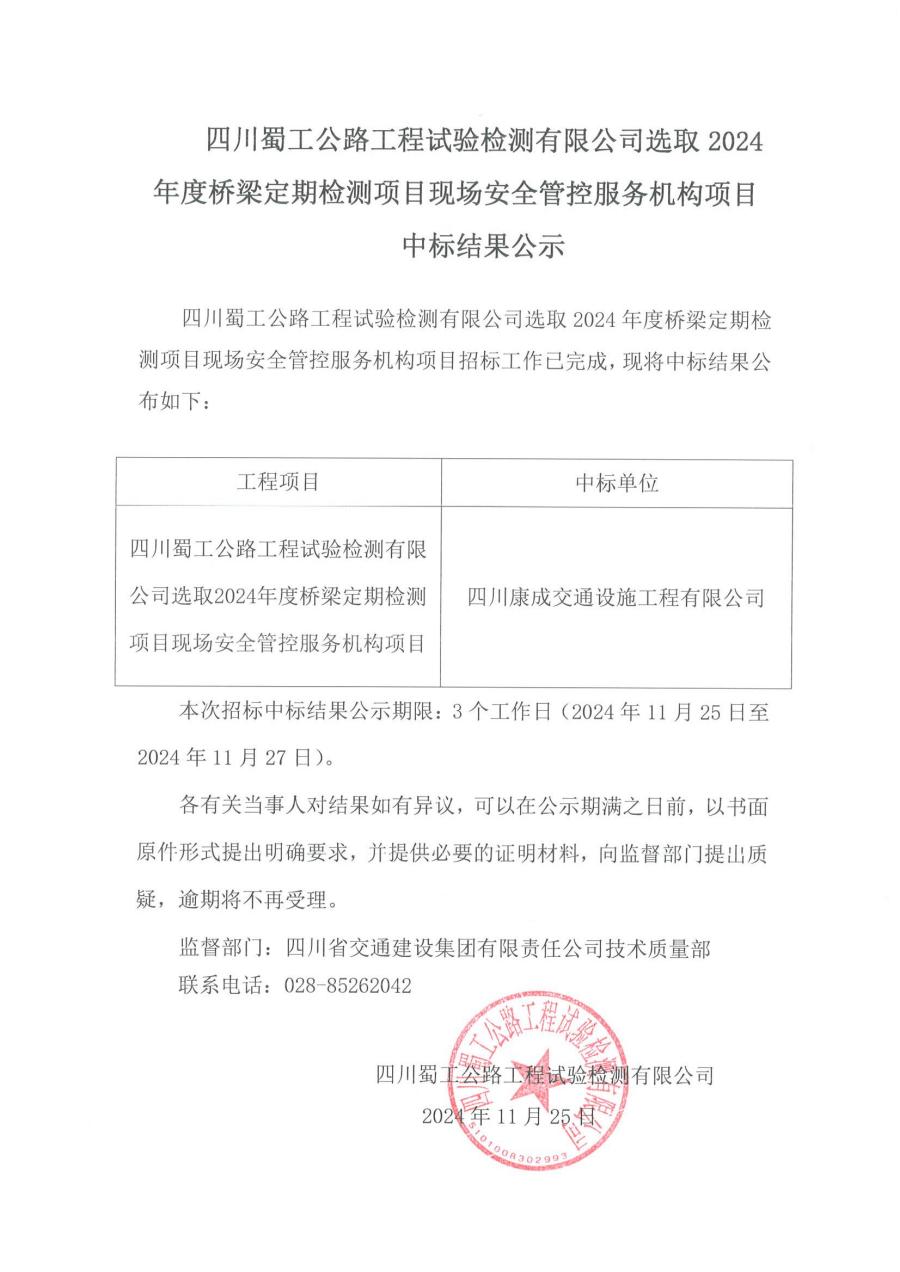 四川蜀工公路工程試驗檢測有限公司選取2024年度橋梁定期檢測項目現場安全管控服務機構項目中標結果公示