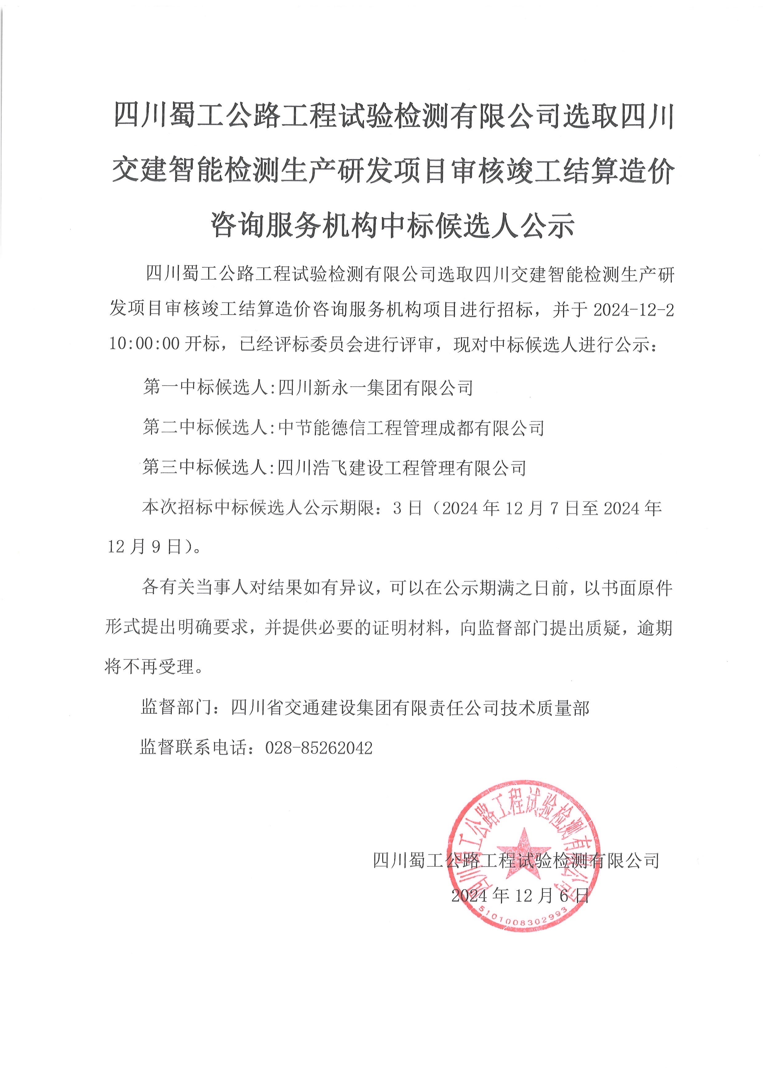 四川蜀工公路工程試驗檢測有限公司選取四川交建智能檢測生產研發項目審核竣工結算造價咨詢服務機構中標候選人公示