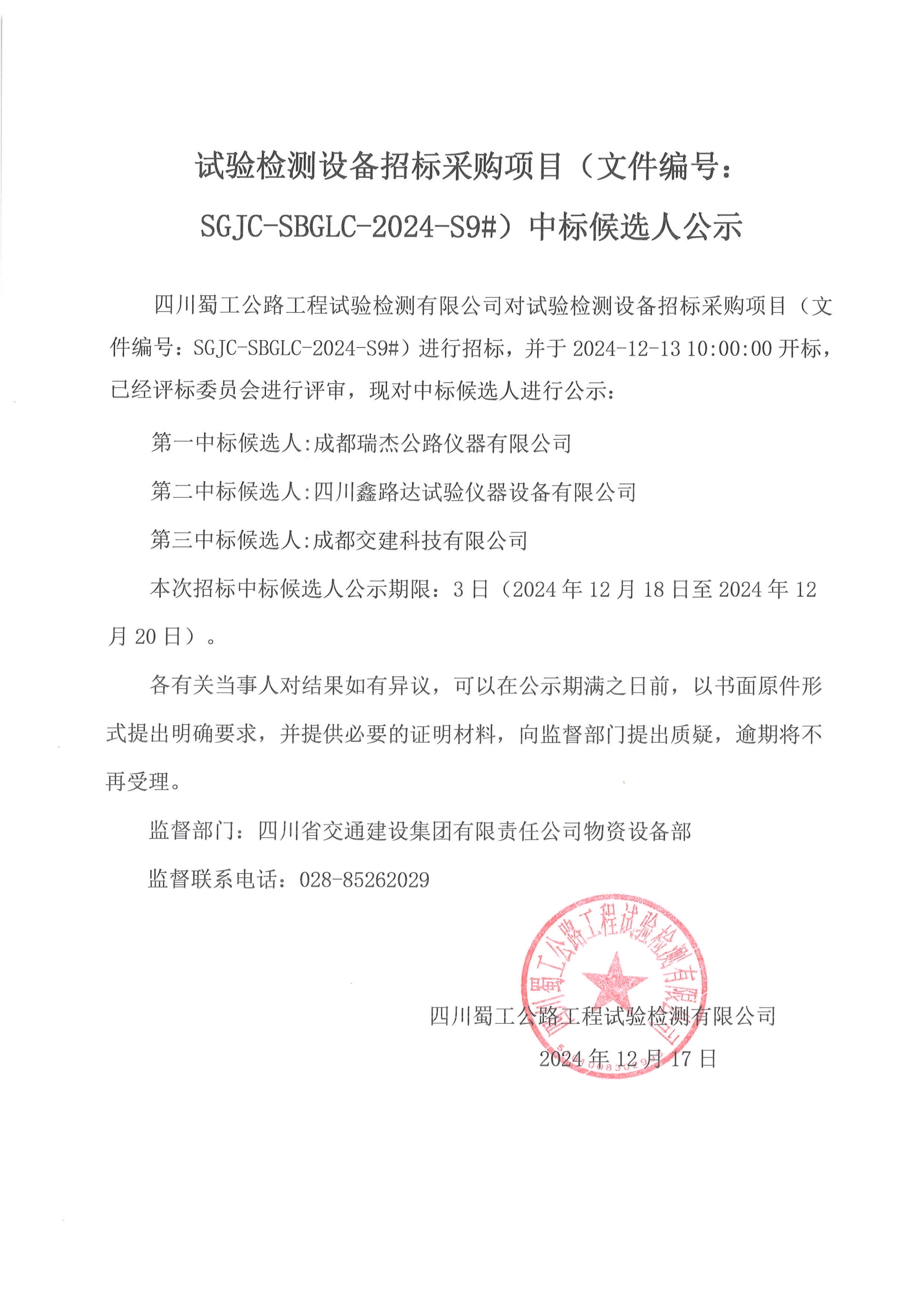 試驗檢測設備招標采購項目(文件編號:SGJC-SBGLC-2024-S9#)中標候選人公示