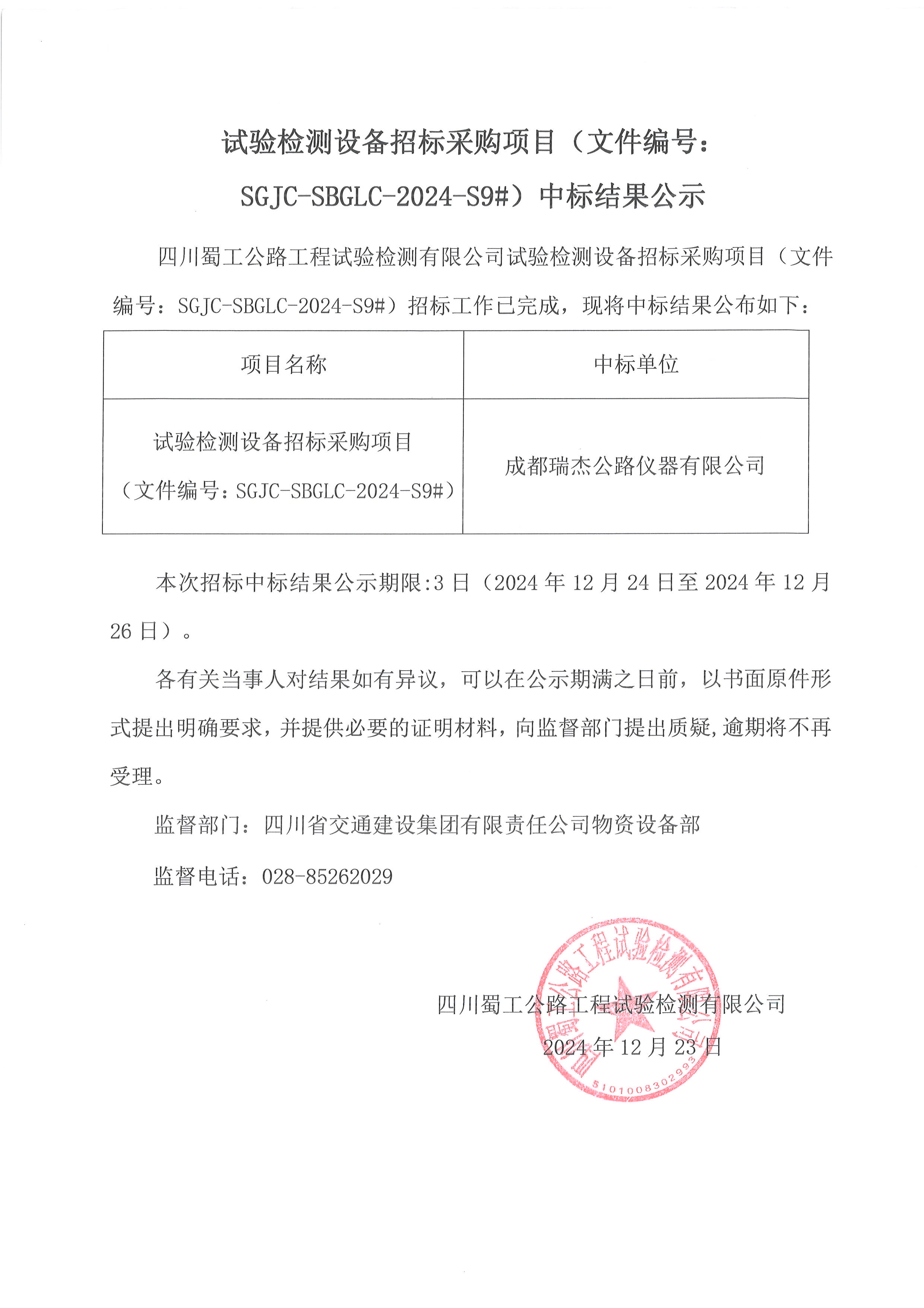試驗檢測設備招標采購項目(文件編號:SGJC-SBGLC-2024-S9#)中標結果公示