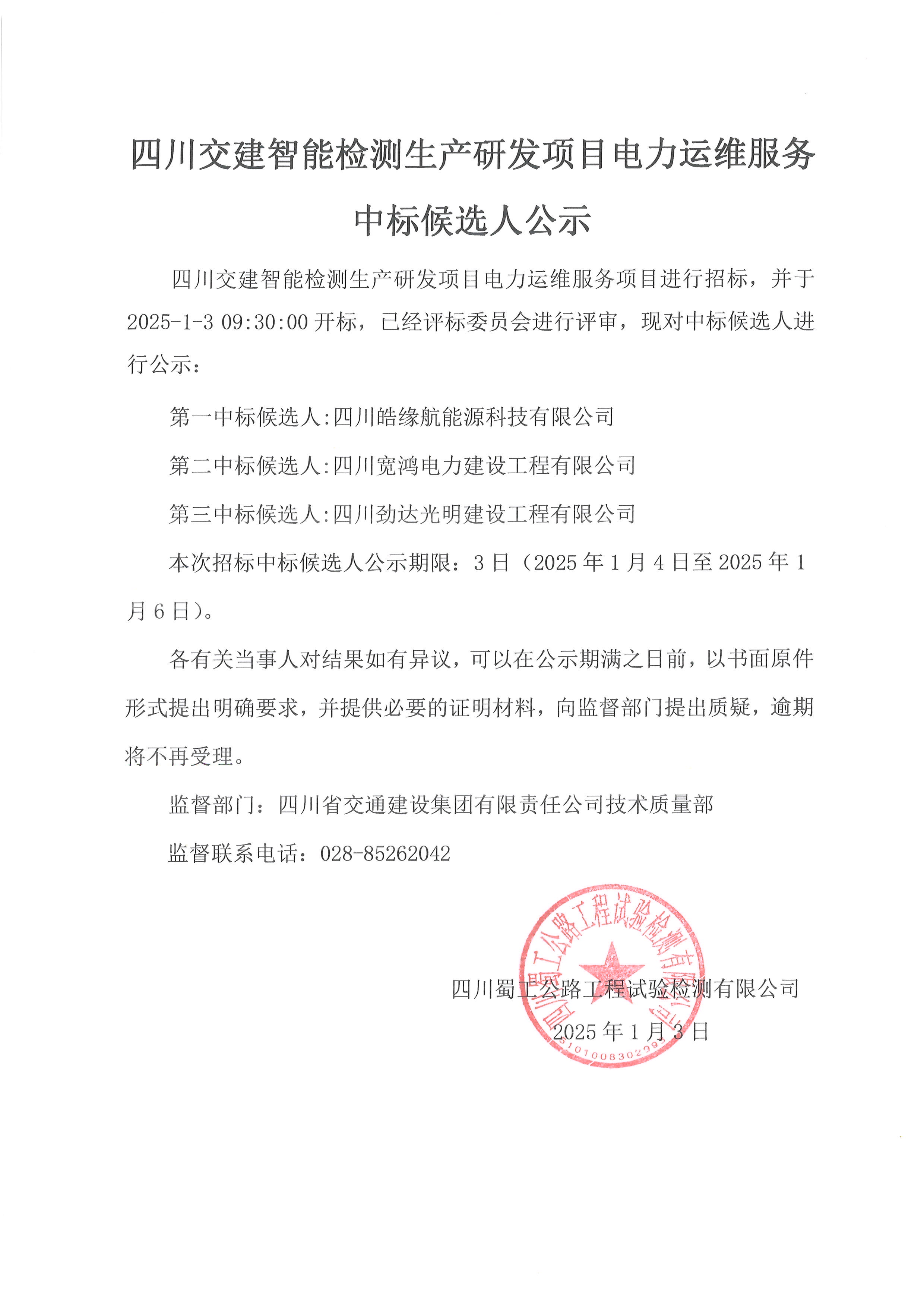 四川交建智能檢測生產研發項目電力運維服務中標候選人公示
