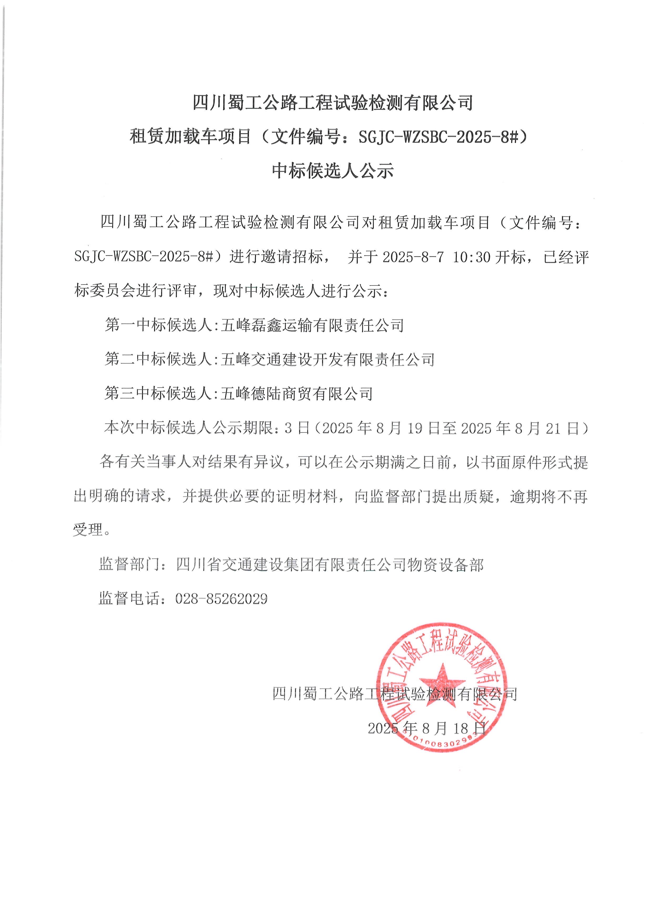 四川蜀工公路工程試驗檢測有限公司租賃加載車項目(文件編號:SGJC-WZSBC-2025-8#)中標(biāo)候選人公示