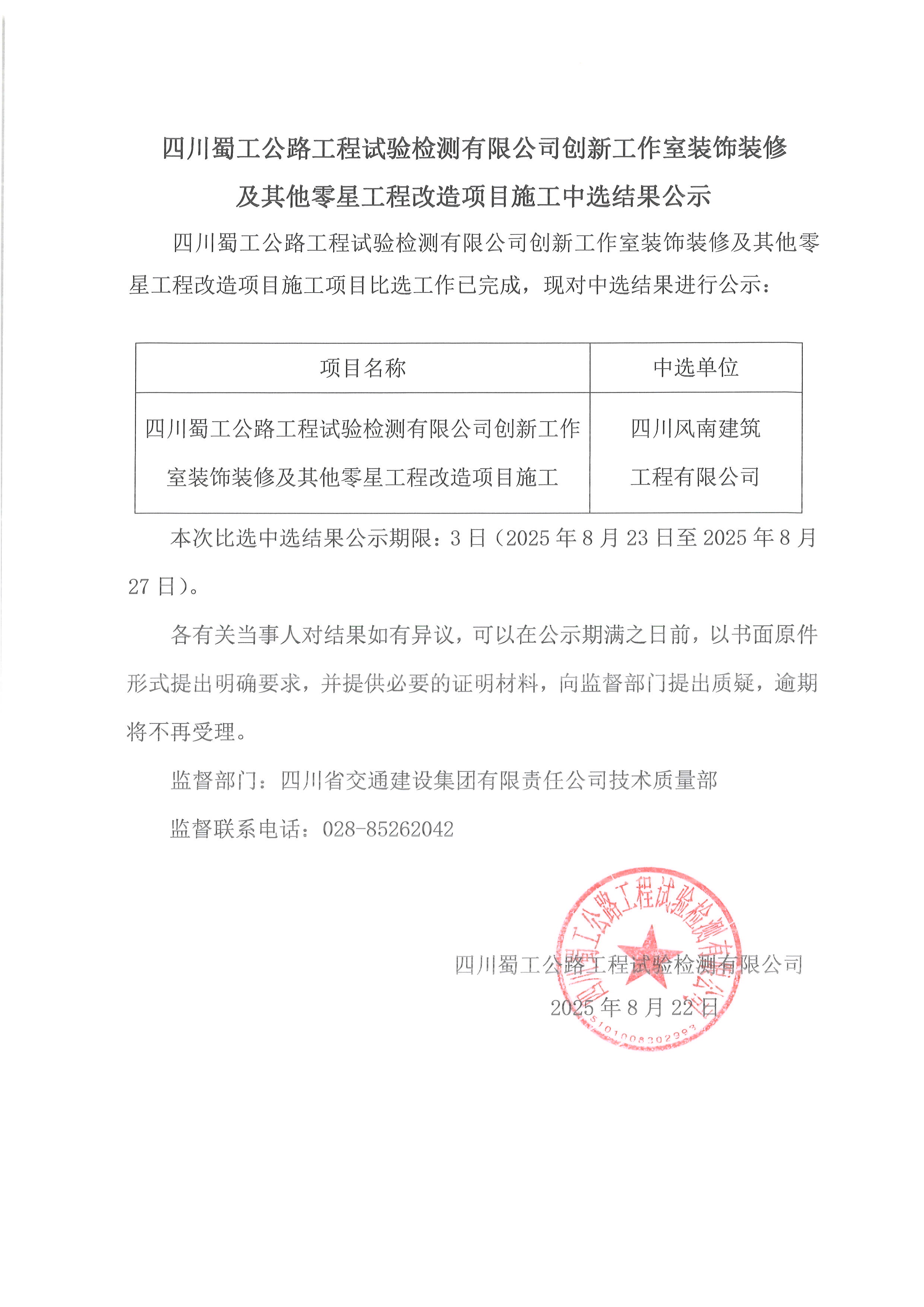 四川蜀工公路工程試驗(yàn)檢測有限公司創(chuàng)新工作室裝飾裝修及其他零星工程改造項(xiàng)目施工中選結(jié)果公示