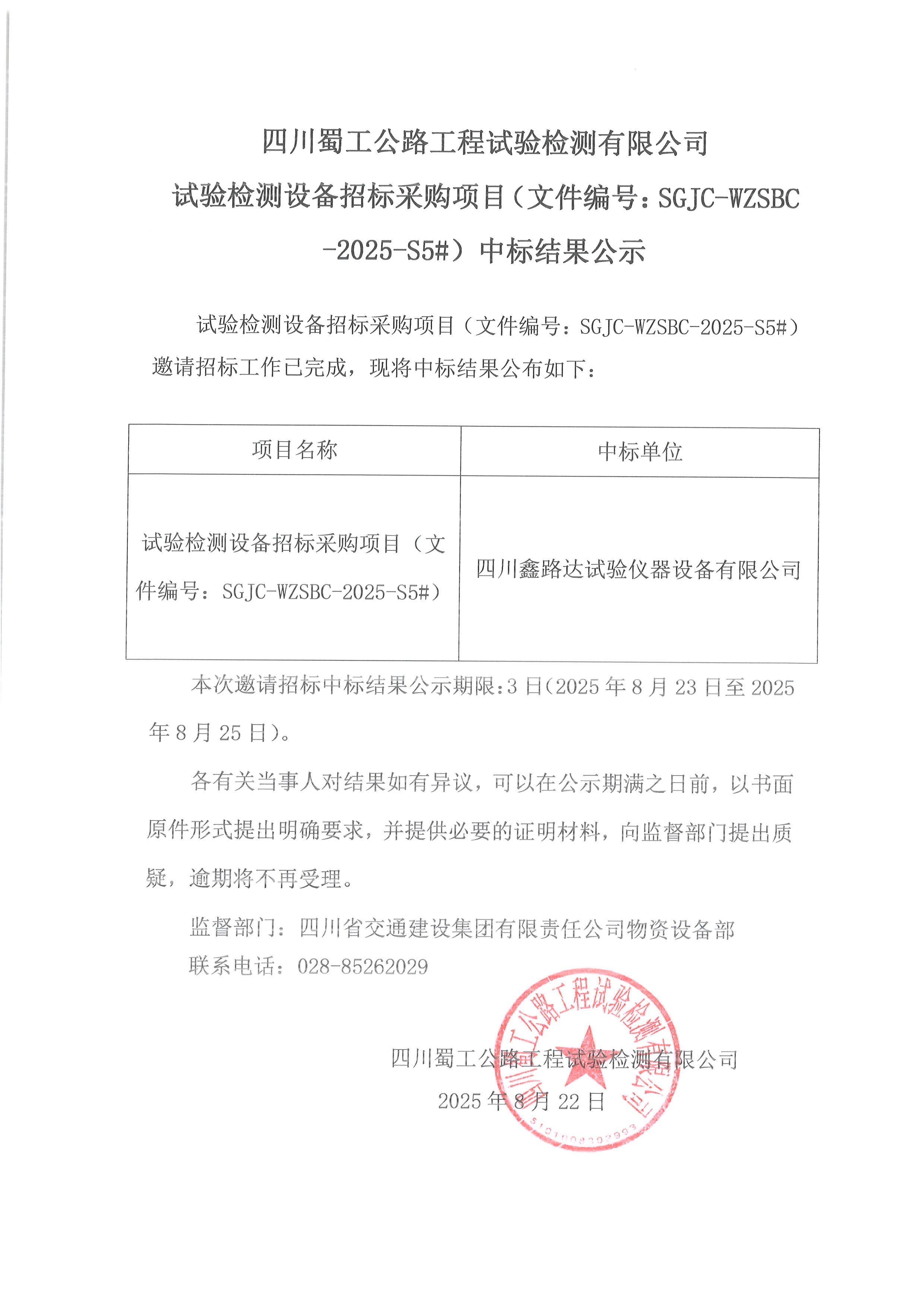 四川蜀工公路工程試驗(yàn)檢測(cè)有限公司試驗(yàn)檢測(cè)設(shè)備招標(biāo)采購(gòu)項(xiàng)目(文件編號(hào):SGJC-WZSBC-2025-S5#)中標(biāo)結(jié)果公示