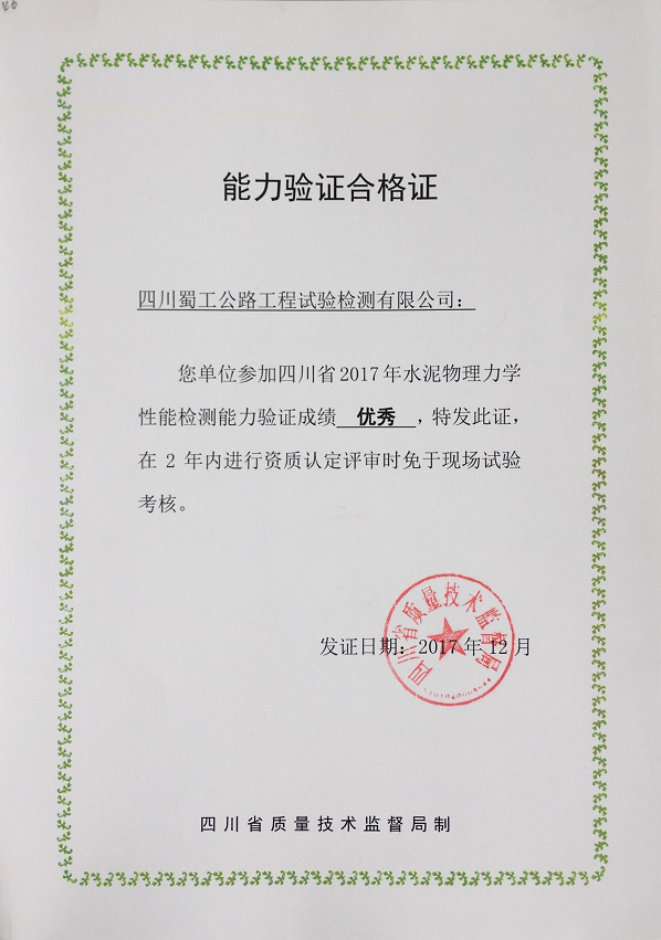 檢測(cè)公司于2017年8月參與了由四川省建材產(chǎn)品質(zhì)量監(jiān)督檢驗(yàn)中心承辦的2017年水泥物理力學(xué)性能檢測(cè)能力驗(yàn)證, 2017年12月以“優(yōu)秀”的成績(jī)通過(guò)驗(yàn)證,并于近日取得能力驗(yàn)證合格證。