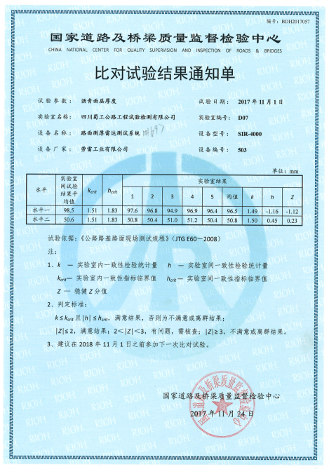 本次比對試驗,我公司報名參加了橫向力系數測試和路面雷達測厚兩個項目,經過4天嚴格精準的測試,我公司提交的檢測結果準確度高、符合性好,一次性獲得通過。公司將繼續以優秀的人才隊伍、專業的技術能力和先進的設備儀器為保障,為各項試驗檢測業務提供一流的服務。