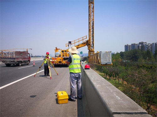 時值盛夏,持續的高溫天氣為現場檢測帶來了巨大的考驗,檢測組成員發揚“老黃牛精神 ”,合理安排現場檢測時段,通過橋檢車作業平臺,采用裂縫觀測儀、精密水準儀等設備對受檢橋梁進行了詳細檢測。歷時35天,項目全體成員克服高溫暴曬、汛期暴雨以及營運高速交通情況復雜等不利因素,順利完成第一階段現場檢測工作。