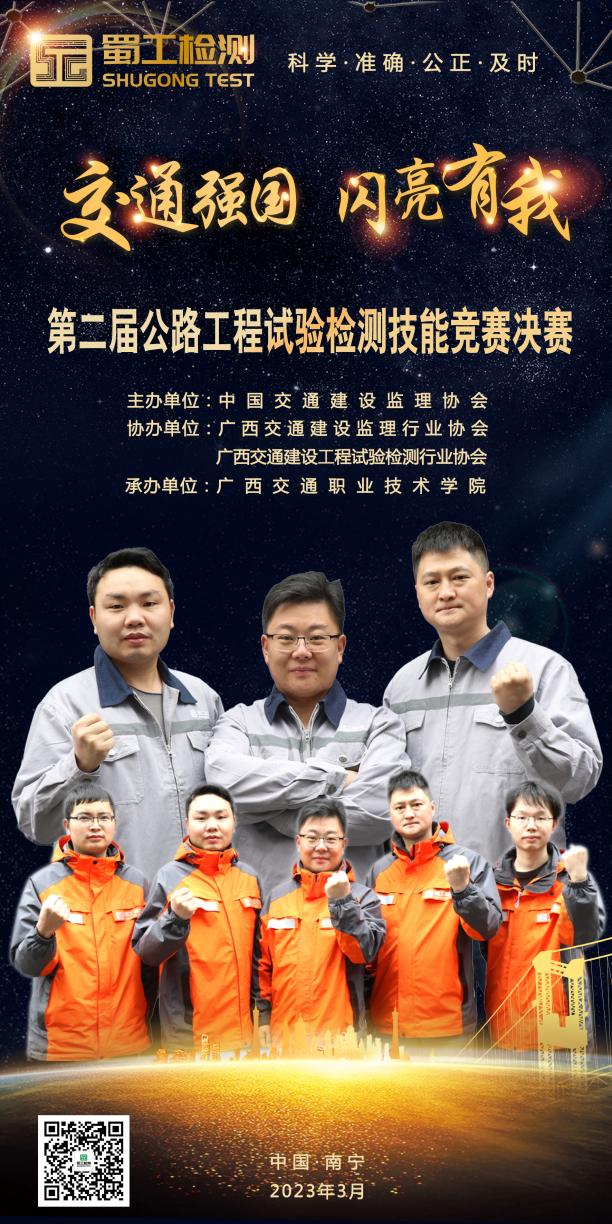 2023年3月24至25日,由中國交通建設監理協會主辦,廣西交通建設監理行業協會和廣西交通建設工程試驗檢測行業協會協辦,廣西交通職業技術學院承辦的全國第二屆公路工程試驗檢測技能競賽決賽在廣西南寧如期舉行。經與全國入圍決賽的50名技能高手戮力鏖戰,蜀工檢測公司代表隊以團體積分“全國第四”的優異成績榮獲中國交通建設監理協會第二屆公路工程試驗檢測技能競賽決賽“團體三等獎”。