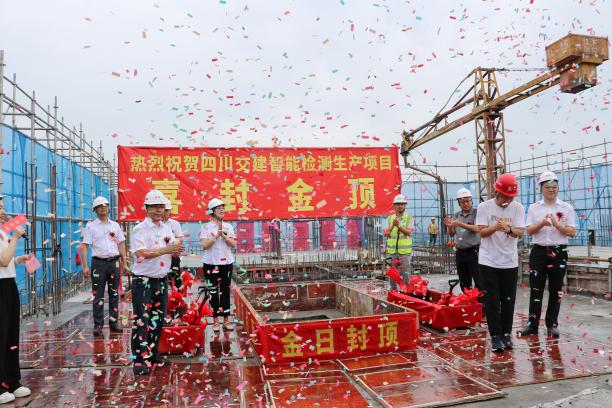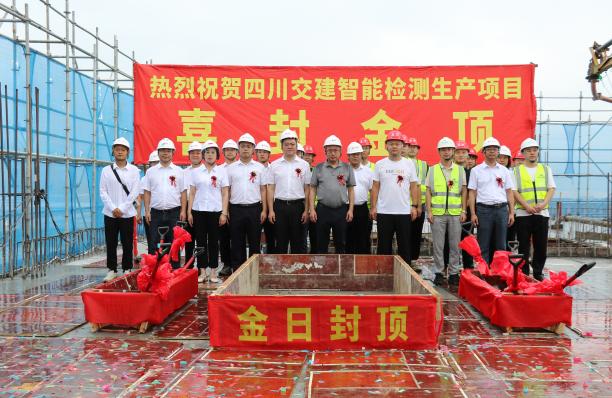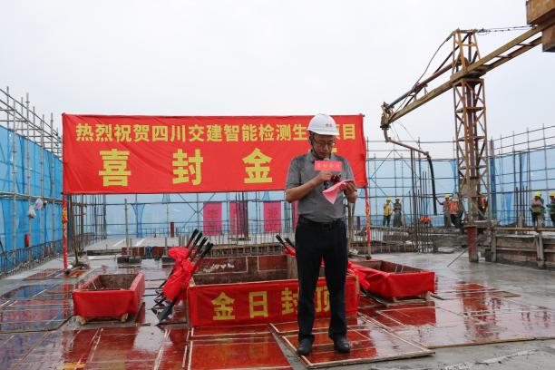 封頂儀式上,蜀工檢測公司黨總支書記、董事長倪建軍對參建者們一年來的辛苦付出表示衷心感謝。他指出,四川交建智能檢測生產研發項目從一紙藍圖到主體封頂,是蜀工檢測公司跨越式高質量發展的里程碑進展,承載著蜀工檢測人的夢想與期盼,要精心將其打造成為行業標桿,助推交建集團建成“西部領先、國內一流的綜合性基礎設施建設集團”,為服務交通強國、質量強國建設貢獻蜀工檢測力量。他要求,各參建單位要集中精力,全力以赴推進項目后期建設,圍繞“蜀工檢測”品牌建設重點工作,繼續嚴格按照組織工序密切配合,切實履行好項目建設安全質量責任,確保項目平安高質建成。