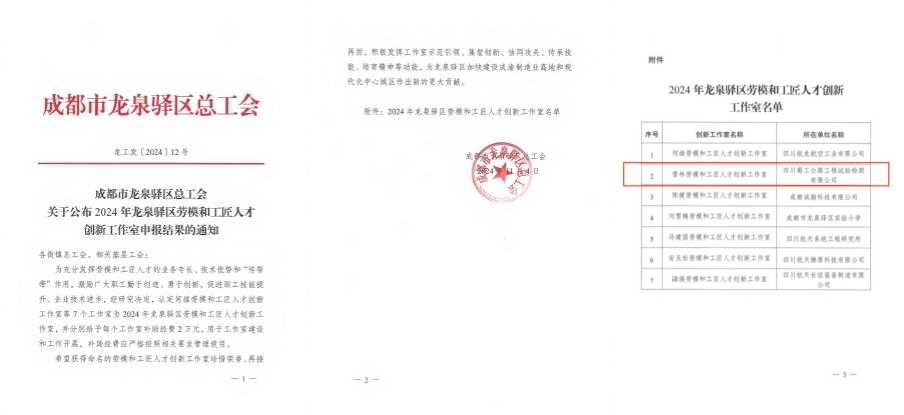 11月4日,成都市龍泉驛區(qū)總工會(huì)印發(fā)通知公布了2024年龍泉驛區(qū)勞模和工匠人才創(chuàng)新工作室申報(bào)結(jié)果,蜀工檢測(cè)公司雷林工匠工作室被命名為龍泉驛區(qū)勞模和工匠人才創(chuàng)新工作室!