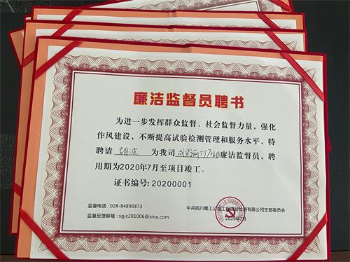 在前期調研的基礎上,公司在成資渝路面、成宜路面、久馬TJ5等六個工地試驗室設置了廉潔監督員崗位。經公司工地試驗室負責人推薦,并報公司黨支部研究決定后,最終聘任敖民燚、劉從宇、胡波、羅仁寶、陳平、李學慧6位同志為公司廉潔監督員。